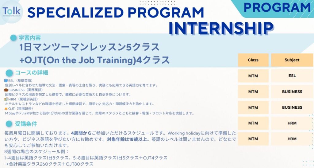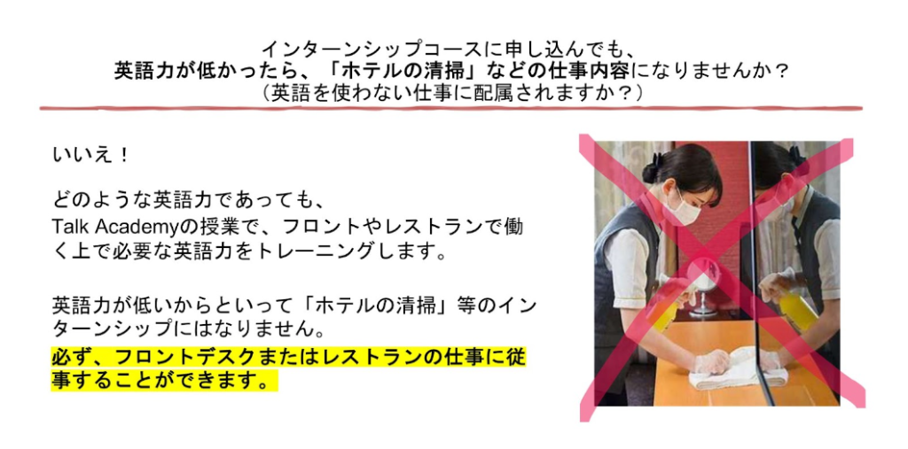 M stay hotelでインターンを行います。『ホテルインターンシップコース』の授業は『ビジネスコース』とほぼ同じ内容です。他校と比較した「ホテルインターンコース」の特徴として、入学時に英語力の基準を設けていない点があります。