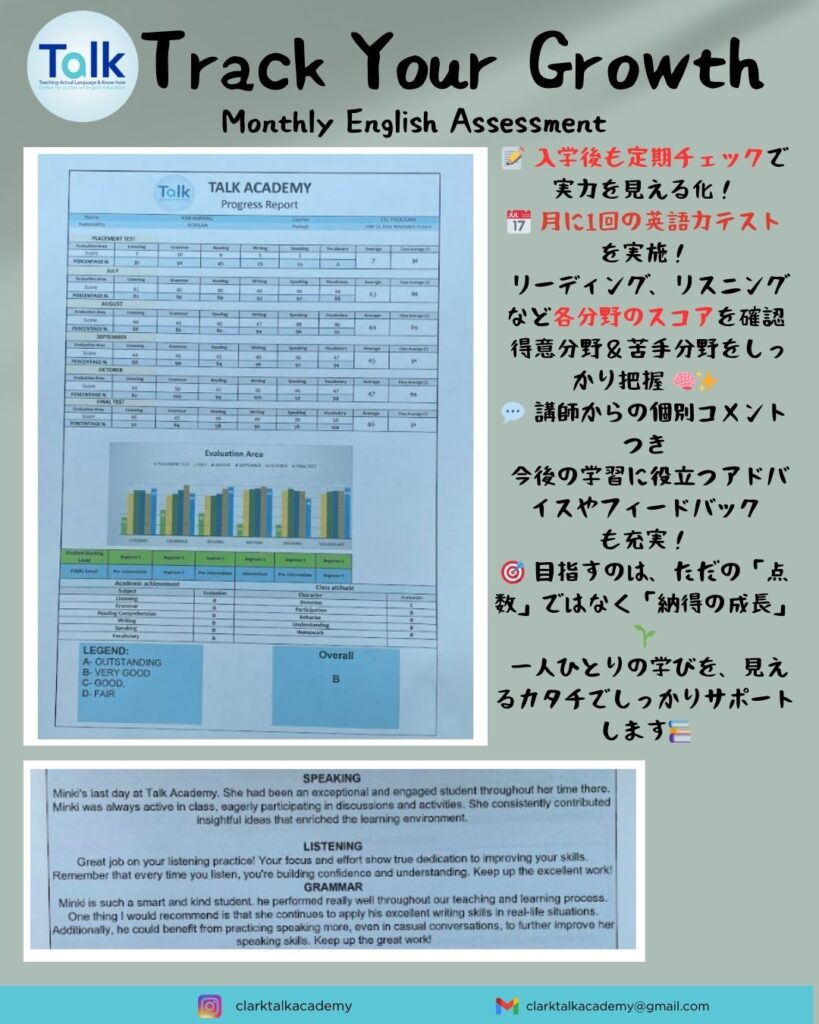 4週間以上留学の生徒様には毎月テストを実施し学習進捗状況が視覚的に分かりやすくなります。
