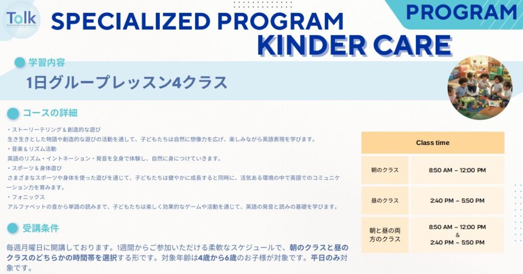 毎週⽉曜⽇に開講しております。1週間からご参加いただける柔軟なスケジュールで、朝のクラスと昼のクラスのどちらかの時間帯を選択する形です。対象年齢は4歳から6歳のお子様が対象です。平⽇のみ対象です。
