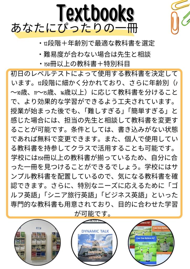 授業が始まった後でも、「難しすぎる」「簡単すぎる」と感じた場合には、担当の先生と相談して教科書を変更することが可能です。条件としては、書き込みがない状態であれば無料で変更できます。また、個人で使用している教科書を持参してクラスで活用することも可能です。学校には150冊以上の教科書が揃っているため、自分に合った一冊を見つけることができるでしょう。さらに、特別なニーズに応えるために「ゴルフ英語」「シニア旅行英語」「ビジネス英語」といった専門的な教科書も用意されており、目的に合わせた学習が可能です。